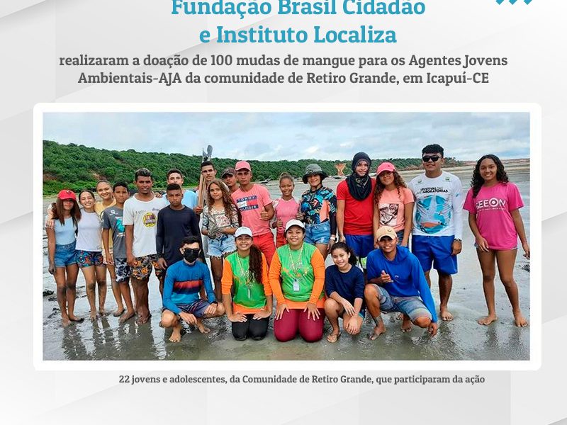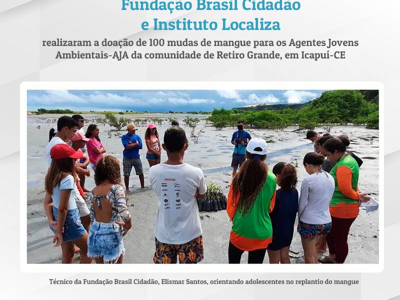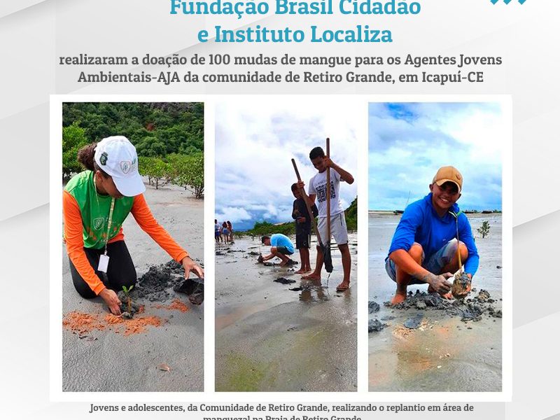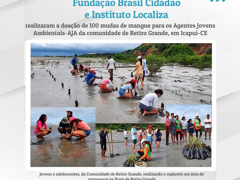 A Fundação Brasil Cidadão junto com o Instituto Localiza realizaram a doação de 100 mudas de mangue para os Agentes Jovens Ambientais-AJA da comunidade de Retiro Grande, em Icapuí-CE, que realizaram neste domingo, 13 de março, ação de replantio em área de manguenzal, na Praia de Retiro Grande. A iniciativa faz parte do Plano de Ação Comunitária-PAC, desenvolvido na comunidade pelas AJAs Isadora Santos e Júlia Nascimento.